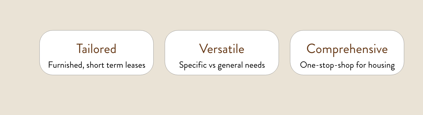 Three competitors were examined as part of this report. Furnished Finder connects landlords of furnished houses and apartments with travel nurses through out the country. Landing leases apartments from complexes, furnishes them, and subleases to traveling professionals in large cities. Rentler connects landlords of unfurnished houses and apartments with users who are looking for long term leases nationwide.