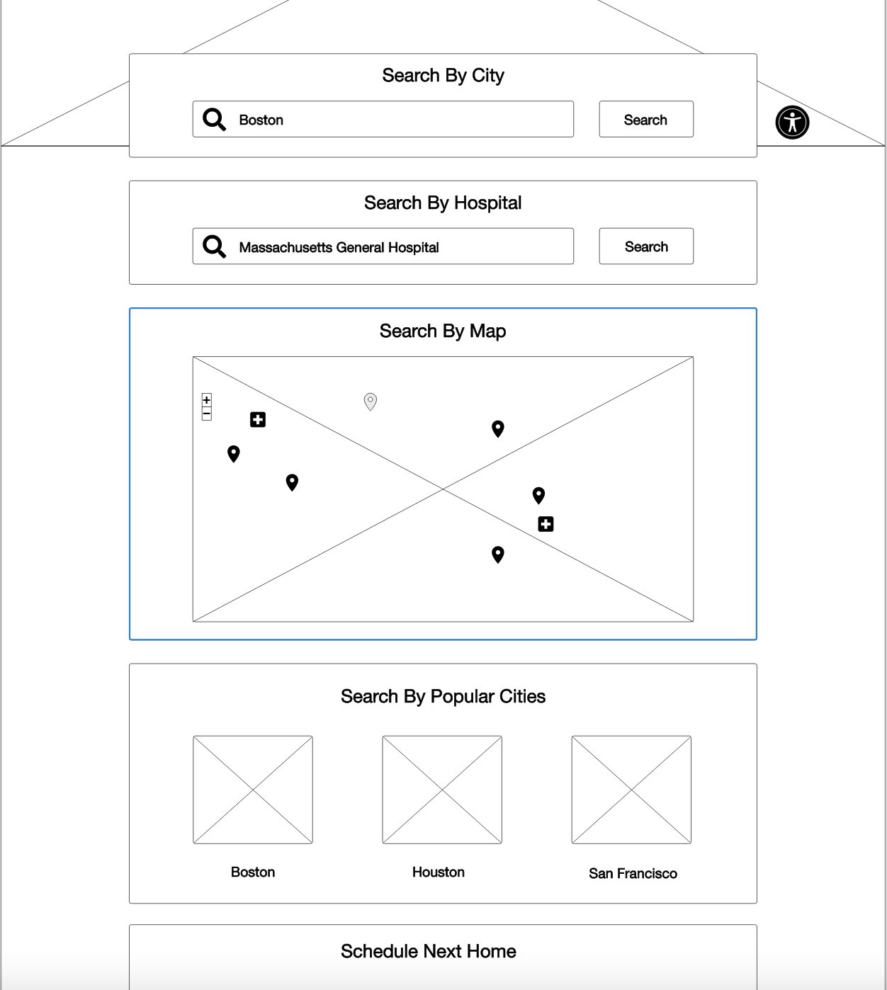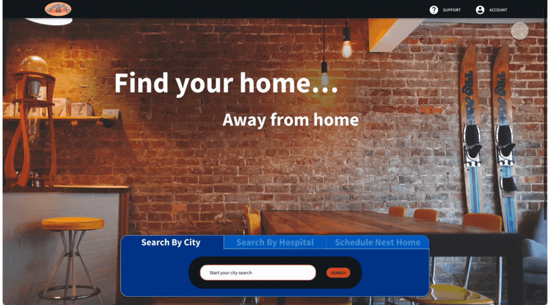 Give three ways to search for homes. Search by city and hospital for those wanting to look through all the listings. “Schedule Next Home” for those who are not particular and just need a place to stay.