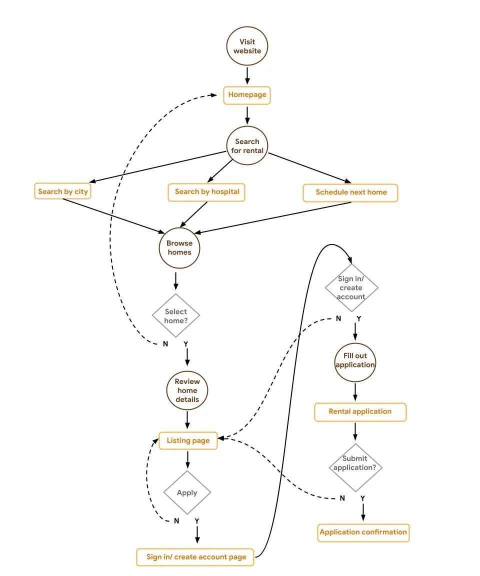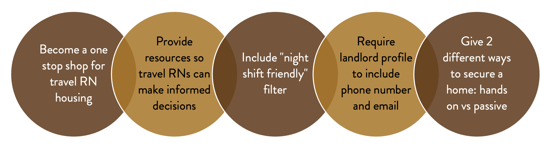 We began our rental house website journey by performing foundational research. Topics explored include how travel nurses felt while house searching, what they looked for in a property, what features they were most willing to compromise, and what they wished they did before they signed the lease. Findings were then used to create interview questions. Five potential Travelpad users were interviewed, leading to an understanding of pain points and unique circumstances travel nurses face as they are house hunting.