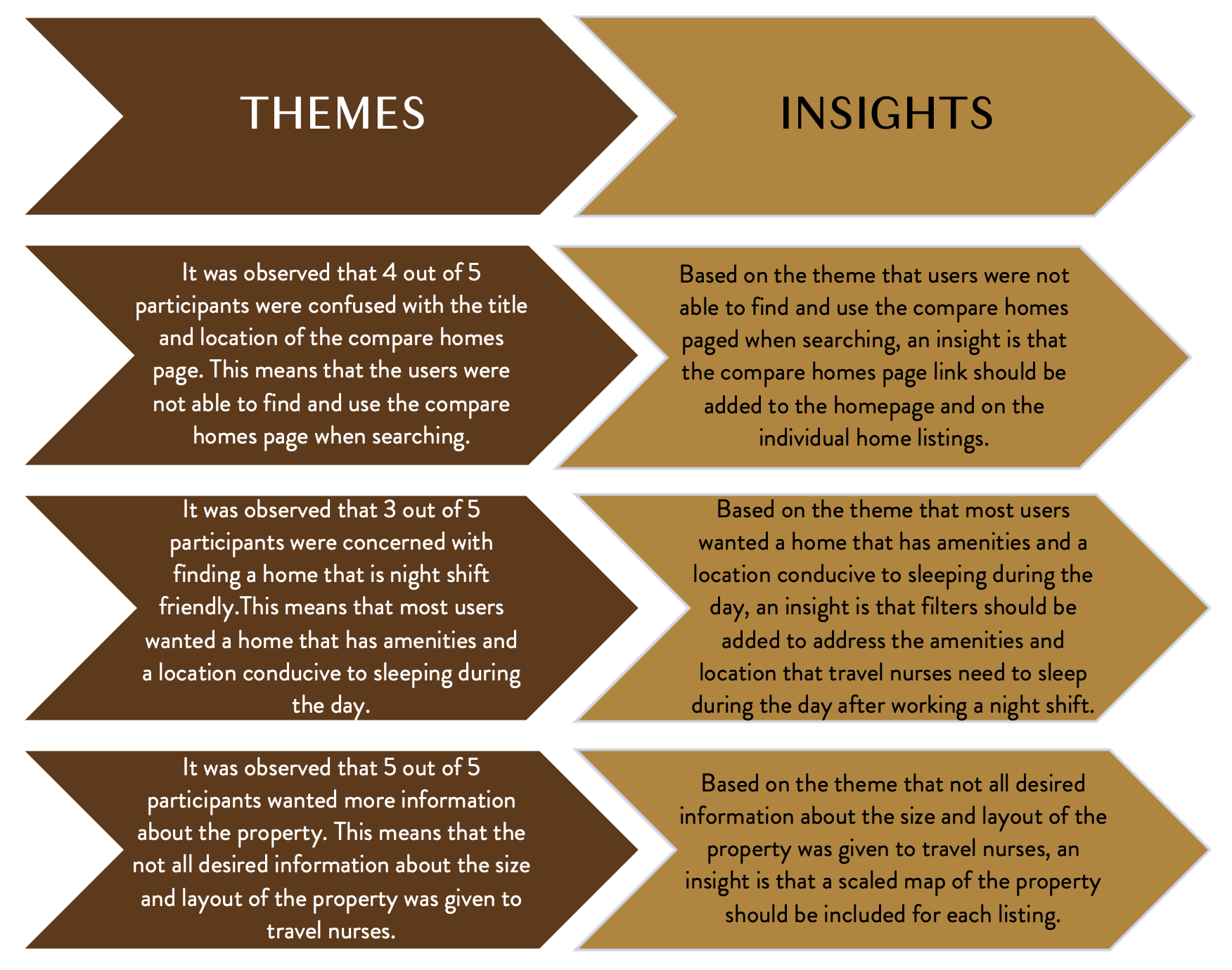 Five diverse users were part of the first usability study. The goal of the study was to figure out if the website provides the search functions and filters that travel nurses need to find a home. This was based on their top ten needs or wants. Key performance indicators were drop off and conversion rates. Major findings from the study include: